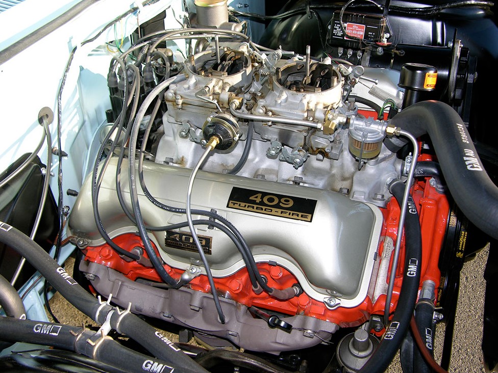 当時この409エンジンにPRO(レギュラー・プロダクション・オプション)コード587の2×4インテーク・システムを組み合わせると、その価格はベース・プライスに484ドルのプラスとなった。これはアルミ製インテークにカーターのAFBキャブレターが2連装された仕様だが、シングル・キャブレター、つまりスタンダード仕様の409エンジンを29馬力上回る、409馬力という驚異的なパワーを発生した。484ドルという金額は当時としてはかなり高価なオプションといえる。それでも、ストリート&ストリップを制したパフォーマンス重視のカスタマーにとっては安い買い物だった。
