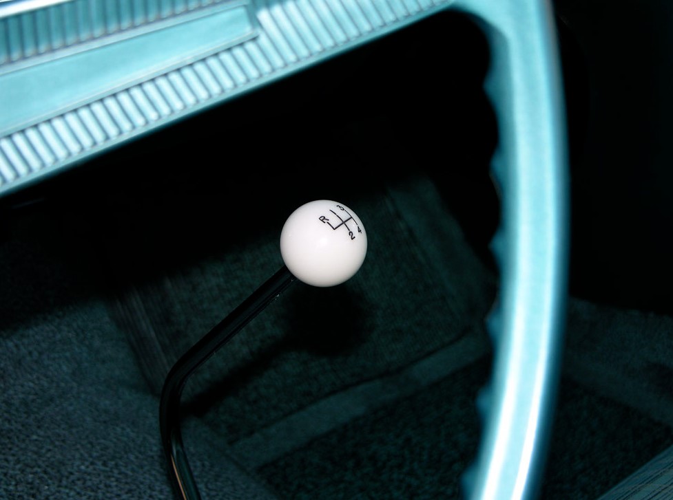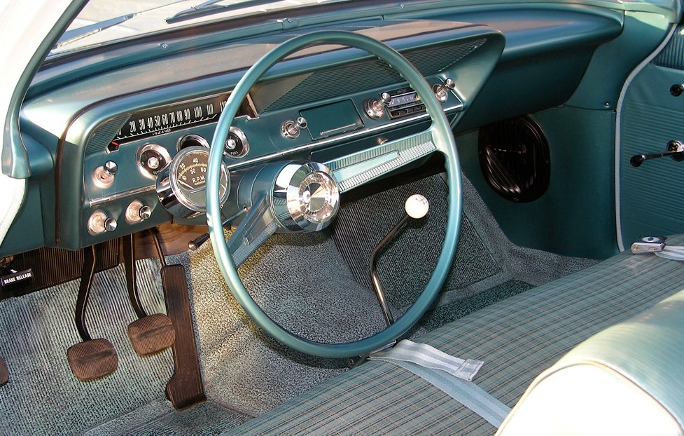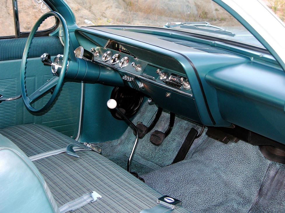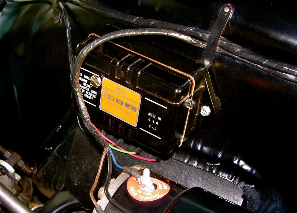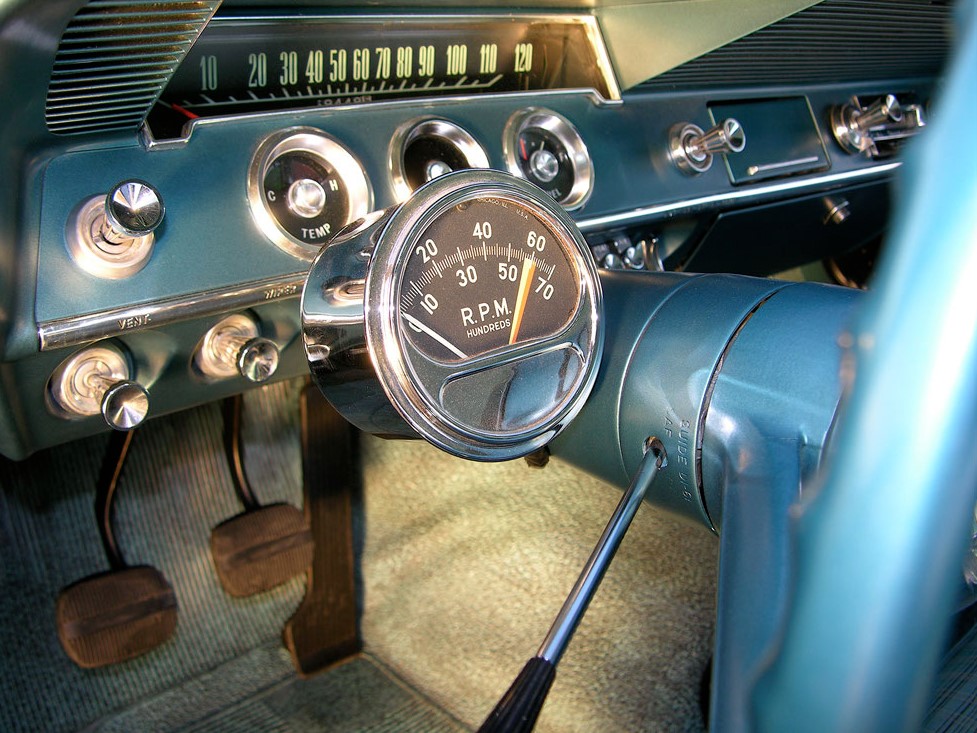 懐かしいスタイルのクロームタコメーター。これは当時49ドルのオプション・アイテムで、409hp仕様の409エンジン搭載車がよくチョイスしていた。サン社のEB-9Aというタコメーター・トランスミッションが当時の409モデルのスタンダード。