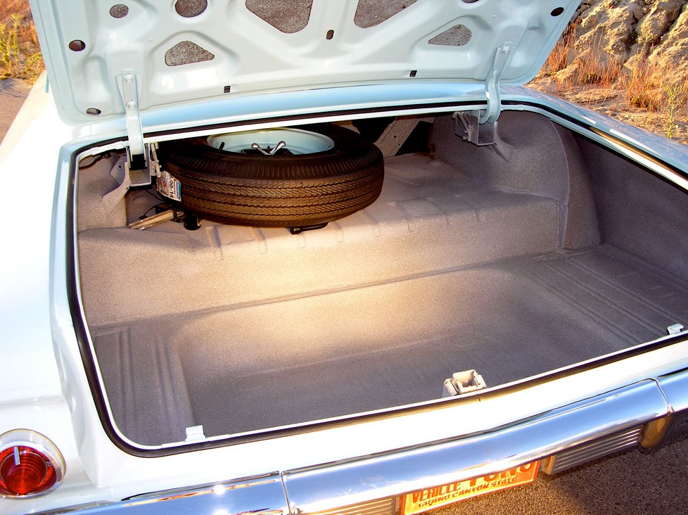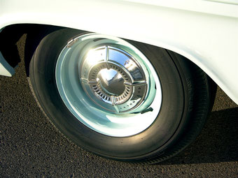 デュアル・エキゾースト(テールパイプ径は2インチ、エキゾースト・パイプ径は2.5インチ)がハイパワー・エンジンを物語る。119インチホイールベースのボディは、オリジナルのトワイライト・ターコイズ(カラーコード917)にリペイント。細部を見れば見るほどその抜かりのないディテーリングに圧倒される。