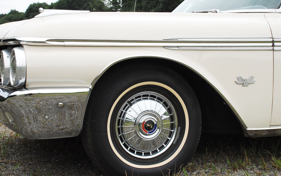 クローズアップしたのは62年型のギャラクシー500XL。この年のフォード・フルサイズはギャラクシー、ギャラクシー500、ギャラクシー500XLとシリーズ分けされており、取材車は最上級に位置したモデルということになる。その具体的な内容の違いだが、500と500XLのエクステリアはほぼ同じであり、主な違いはインテリアの仕様である。写真からも確認できるが、500XLの大きな特徴としてはバケットタイプのフロントシートとセンターコンソール、そしてフロアにレイアウトされたATのシフトレバーなどが挙げられる。