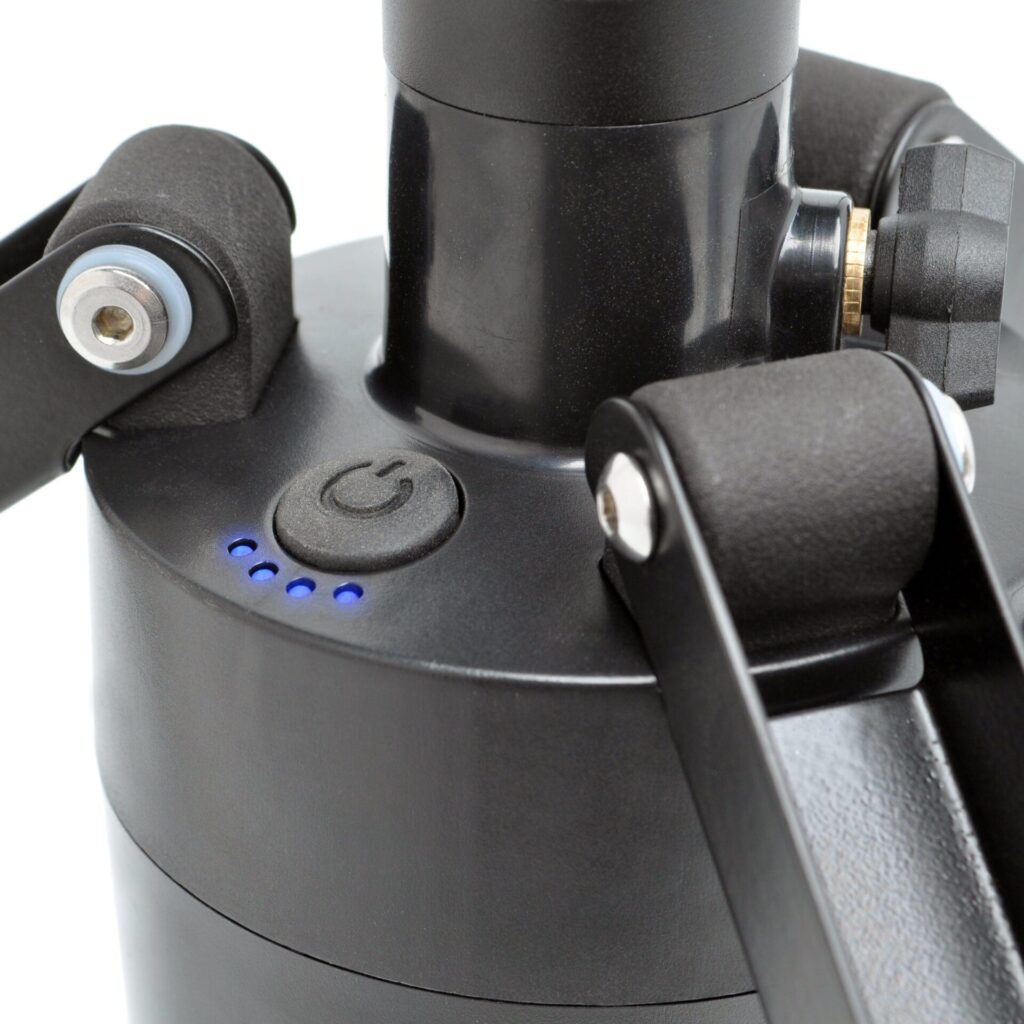 Battery level is indicated by 4 blue LEDs surrounding the power button
